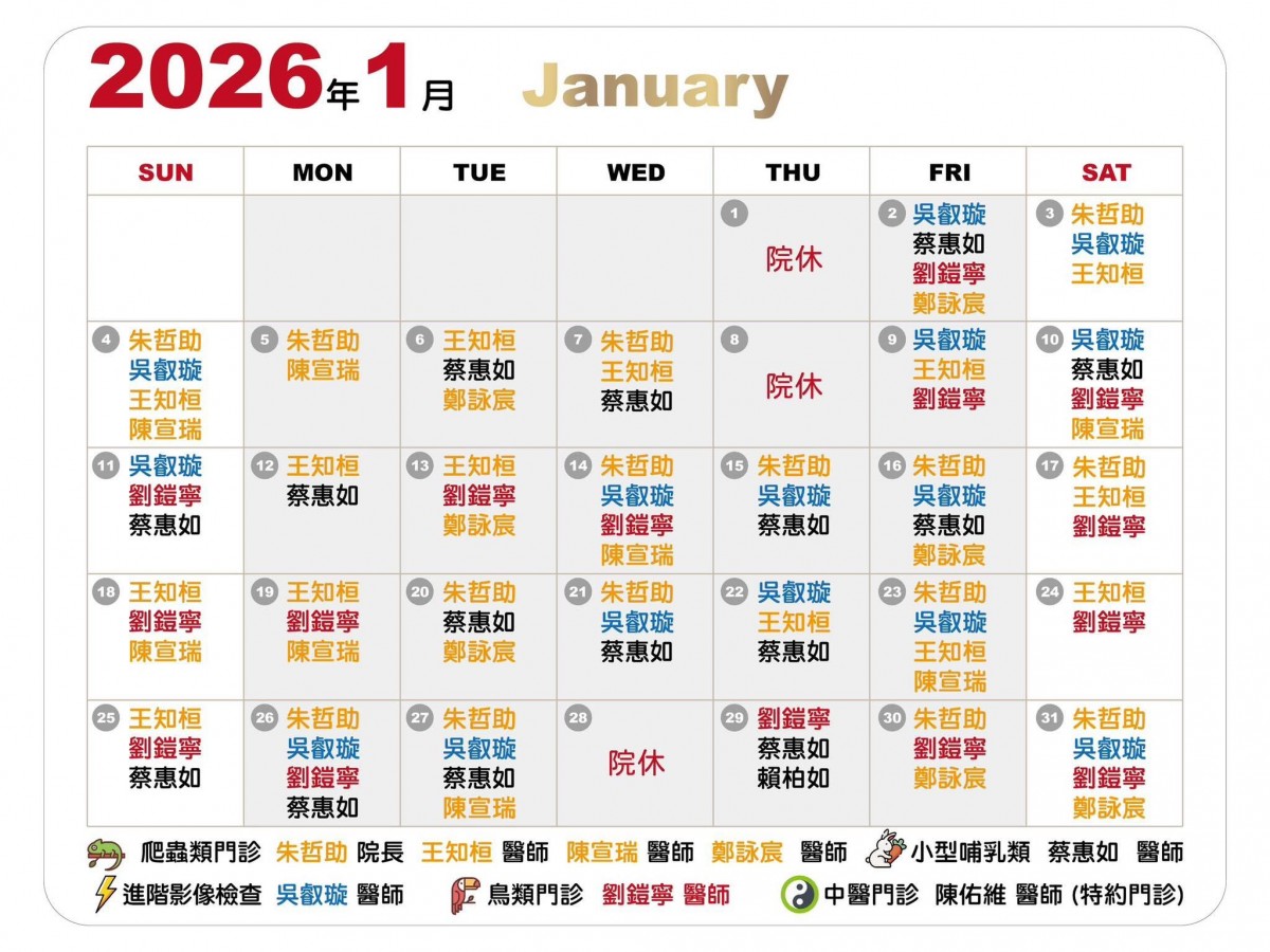 ⛔️ ㄧ月份院休日期為:1/1、1/8、1/28